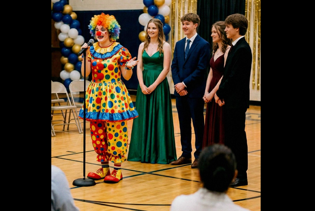 A fileira de trás dele começou a rir baixinho, duas garotas tiraram selfies e, de repente, parecia que toda a turma do último ano tinha entrado na brincadeira — perucas, narizes postiços e gravatas borboleta enormes.